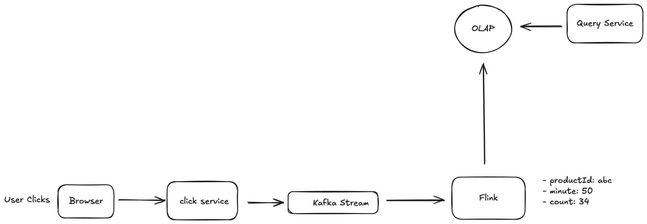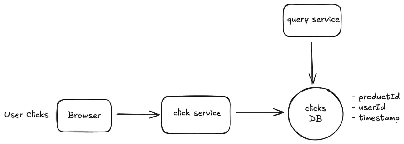 The above is a very simple diagram which shows that a user clicks on a product in the browser which then send an HTTP post request to a click service which records that click in a clicks Database let’s a Postgres.