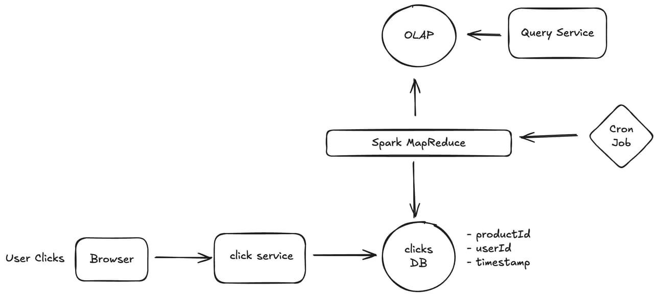 First we should use a write optimised database like Cassandra for storing the click events in place of a typical Postgres DB. This still doesn’t address the issue of slow queries.
